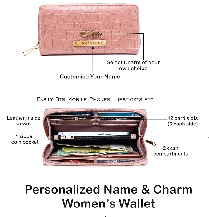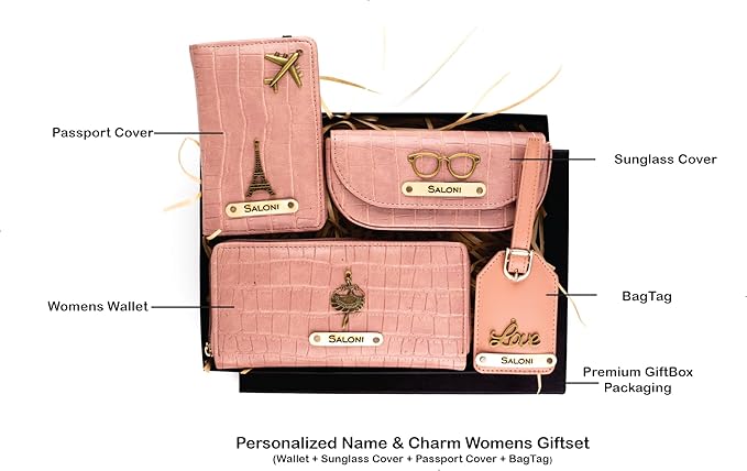 AICA Personalized Name & Charm Self-Textured Leather Wallet Women’s Combo Giftset (NudePink) | Birthday Anniversary Wedding Gifts for Women
