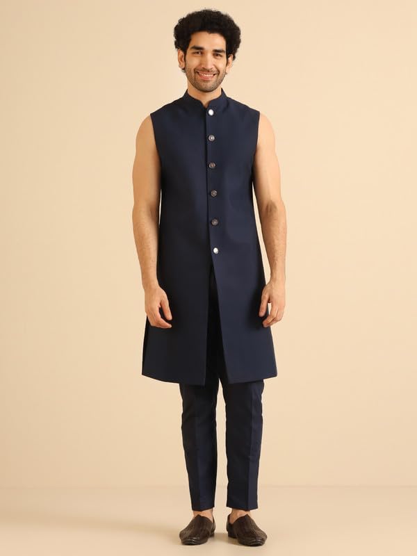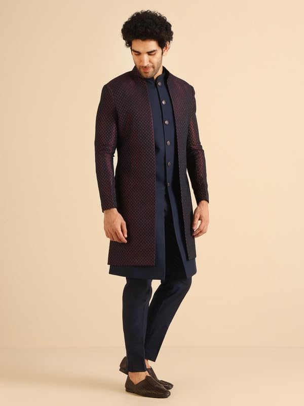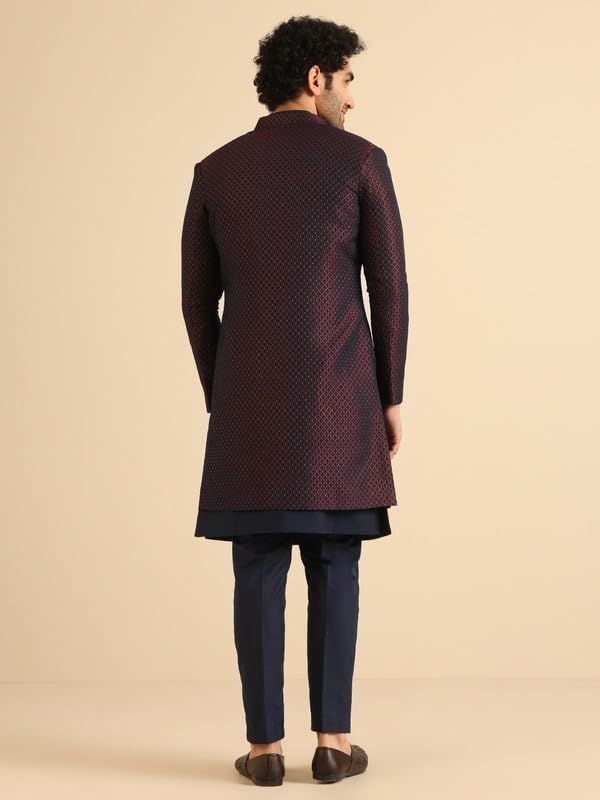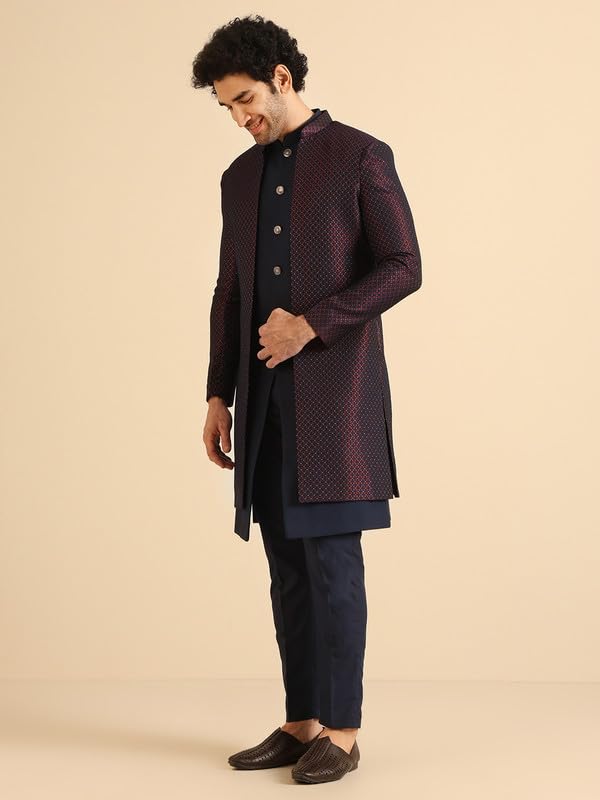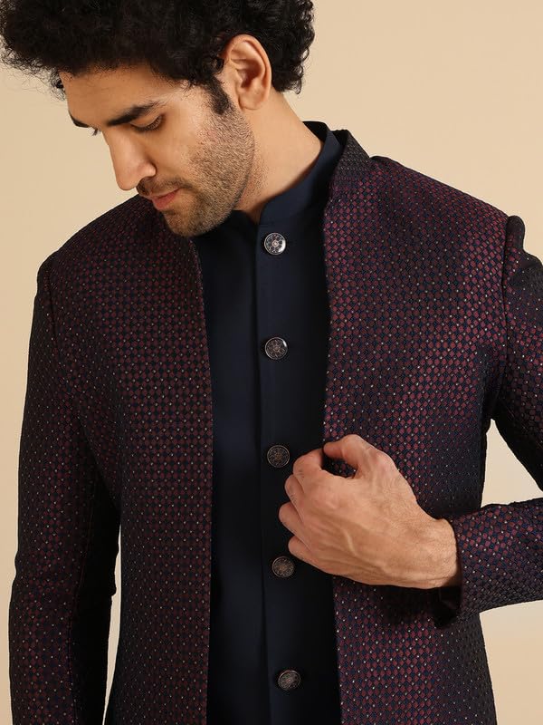 Be the first to review “KISAH Men’s Indo-Western Waistcoat Sherwani Trouser Set, Wine Jacquard, Woven Design Regular Fit Mandarin Collar Long Sleeves”